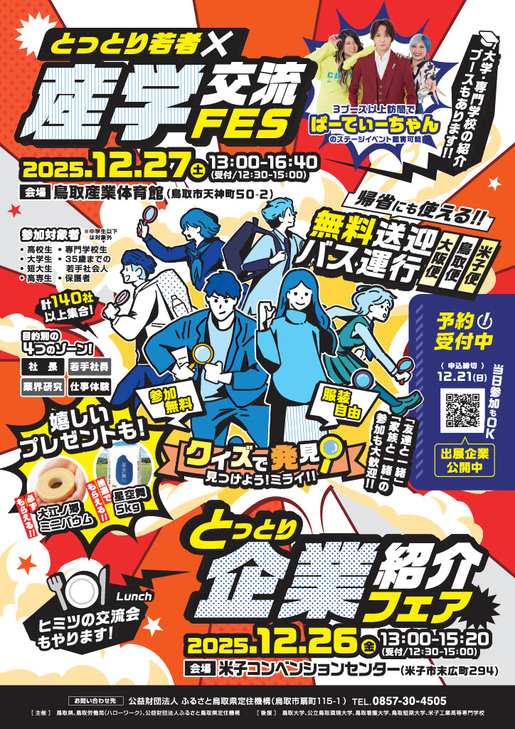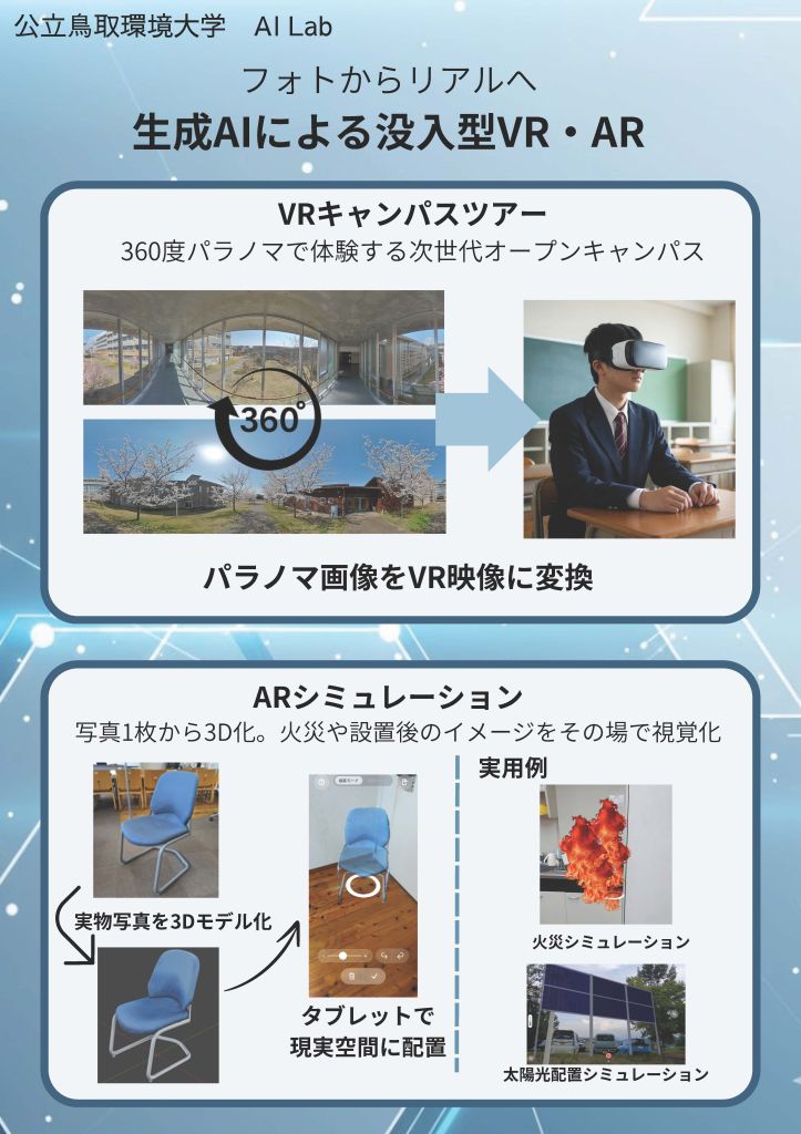 2025年12月27日(土)13:00-16:40に鳥取産業体育館で開催されました「とっとり若者×産学交流FES」にて「フォトからリアルへ 生成AIによる没入型VR・AR」と題して堀ゼミの研究展示を行いました。