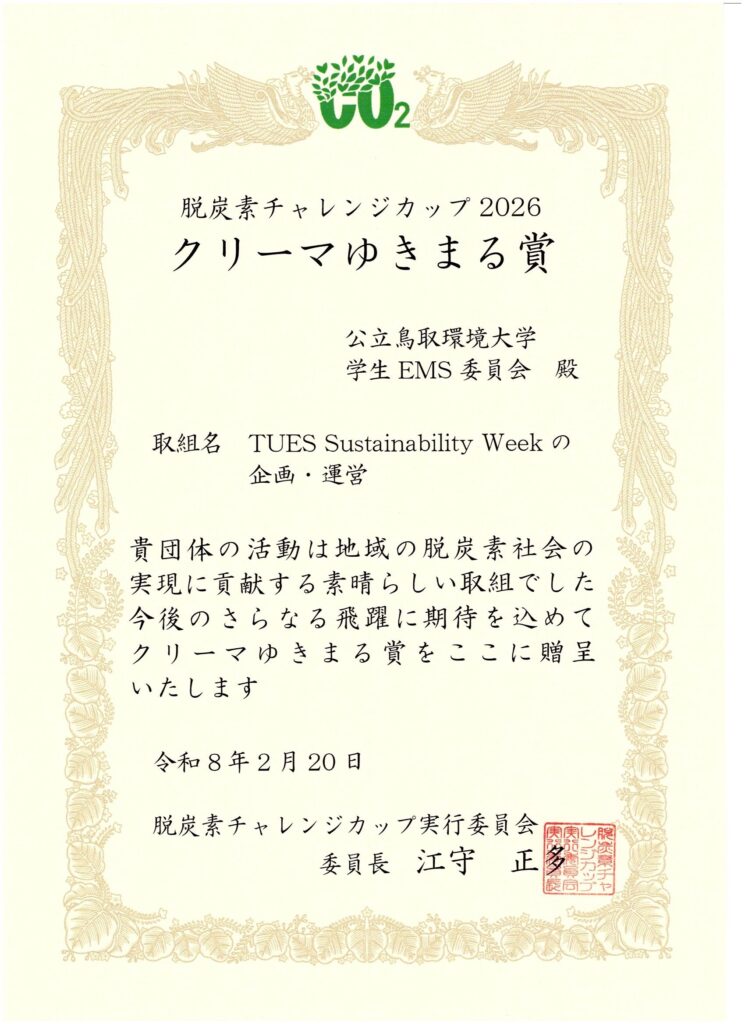 「脱炭素チャレンジカップ」は、CO2排出量の実質ゼロを目的とした地球温暖化防止に関する地域活動について、優れた取組を表彰している全国大会です。本学の学生EMS委員会が「TUES Sustainability Weekの企画・運営」の取り組みでクリーマゆきまる賞を受賞しました。脱炭素チャレンジカップのページはこちら