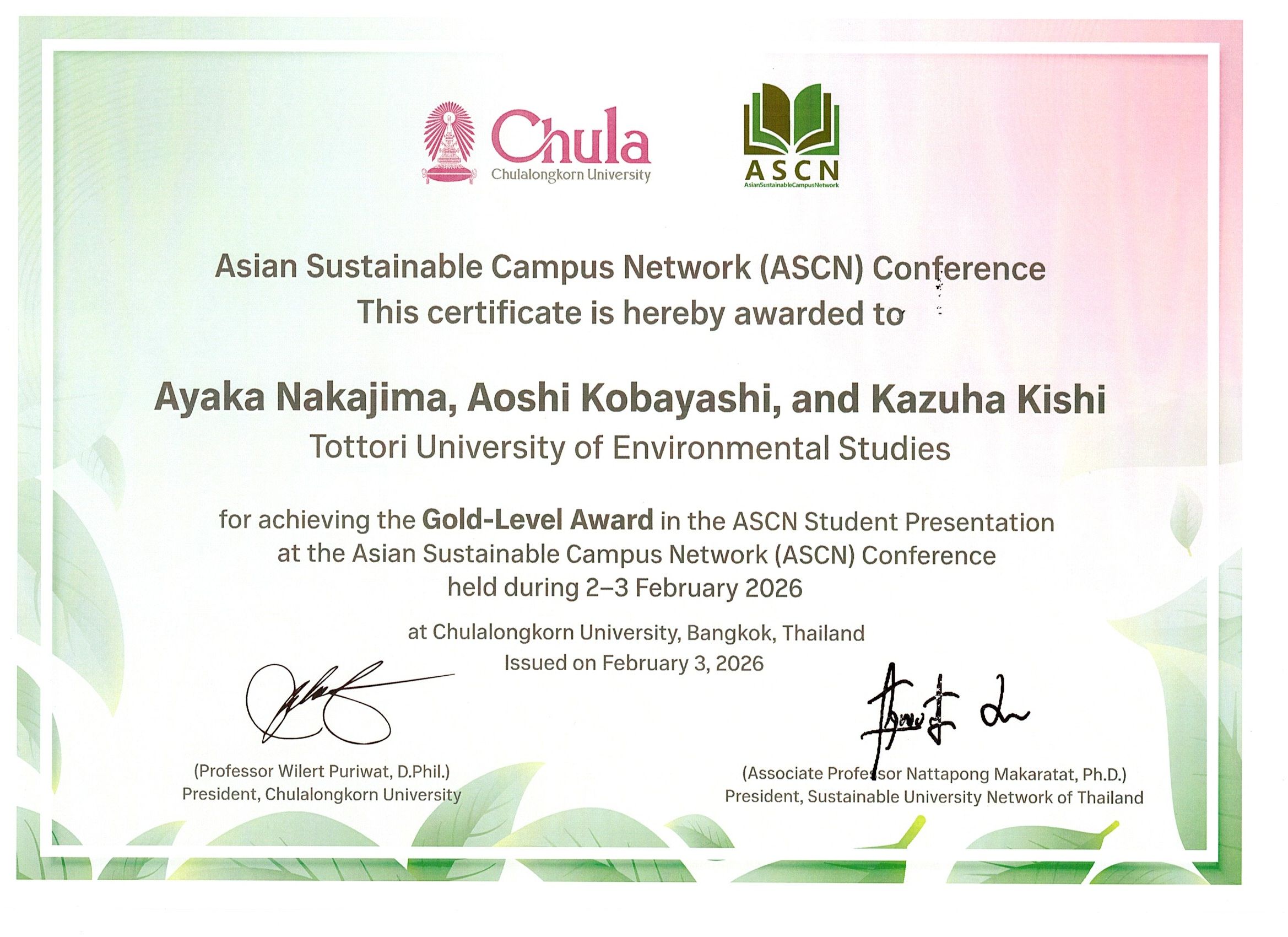 2026年2月2日(月)~2月3日(火)にタイ・チュラロンコン大学で開催されました10th ASIAN Sustainable Campus Network(ASCN)Conferenceにおいて本学の中島彩花さん(経営学部1年)、小林碧志さん(環境学部4年、堀ゼミ)、岸和葉さん(環境学部1年)の発表 “A Student-Led Campus Initiative for Sustainability Engagement: The Practice of TUES Sustainability Week” が学生プレゼンテーション部門においてGold-Level Awardを受賞しました。