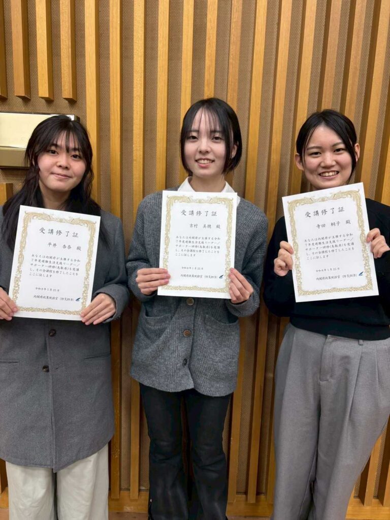令和8年1月24日(土)、2月23日(祝)の2日間にわたり、鳥取県庁にて「避難生活支援リーダー/サポーター研修」が開催されました。本研修において、本学の平井杏奈さん、吉村美穂さん、寺田桐子さん(いずれも環境学部3年)が所定のプログラムを終え、修了証を授与されました。